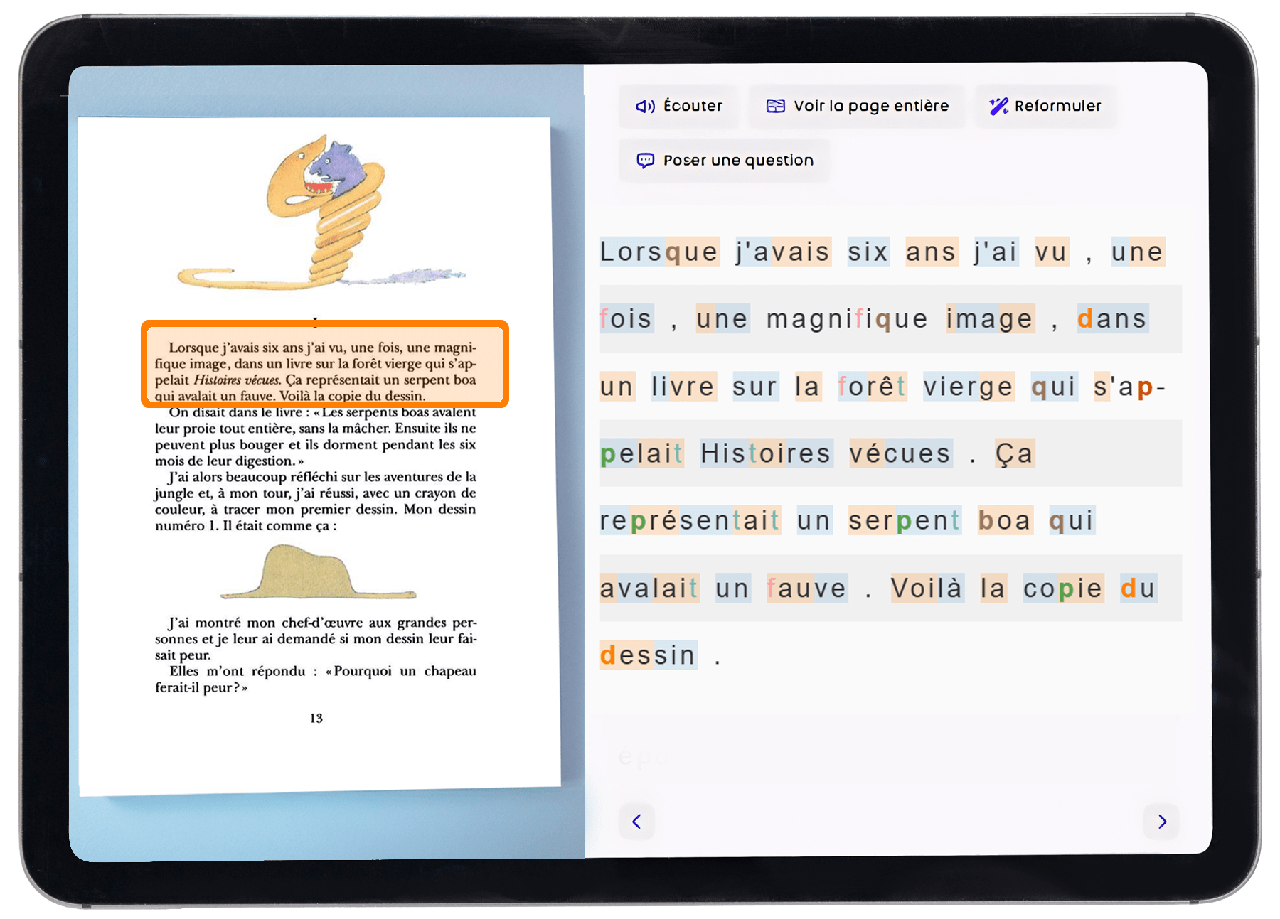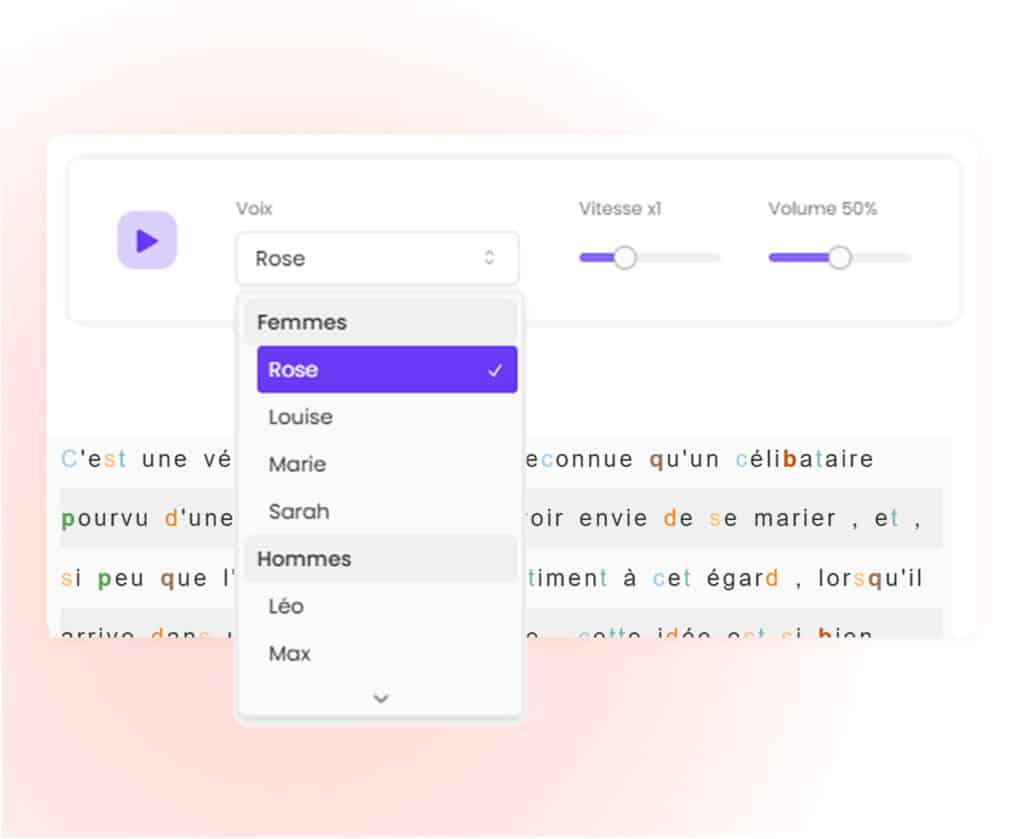 La synthèse vocale transforme chaque texte en audio. Votre enfant peut écouter tout en lisant et comprendre plus facilement.
