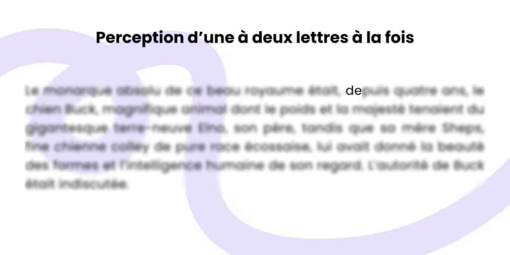 Un normo-lecteur a un empan visuel, c’est-à-dire le nombre de lettres qu’il peut traiter en un seul coup d’œil, d’environ 7 à 9 lettres. Ce chiffre peut chuter jusqu’à 1 ou 2 lettres à la fois en cas de dyslexie.