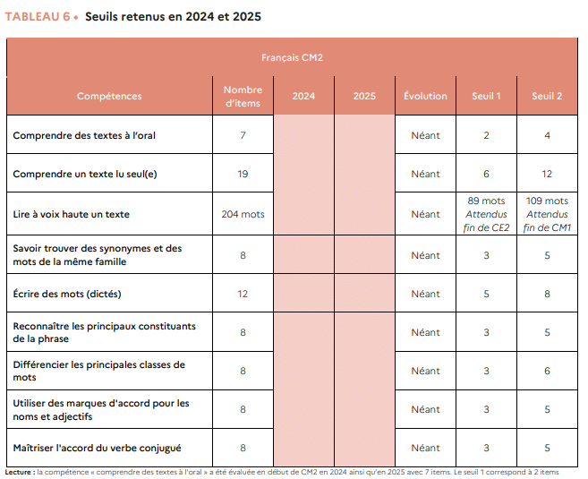 Pour un élève de CM2, on peut observer (page 24) qu’en dessous de 109 mots lus, l’enfant est considéré en difficulté. Il en est de même en dictée si moins de 8 sur 12 mots sont correctement écrits.