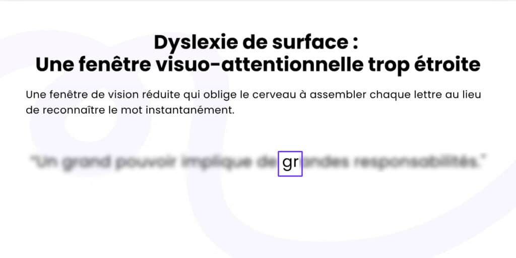 La dyslexie de surface est principalement causée par une fenêtre visuo-attentionnelle trop étroite. Le cerveau de l’enfant ne peut pas traiter toutes les lettres d’un mot simultanément, ce qui empêche les mots de s’enregistrer durablement dans sa mémoire.