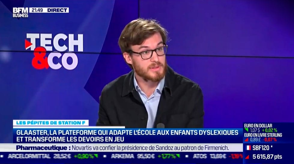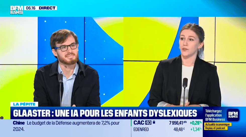 Ce lundi 20 février, Antoine Auzimour, cofondateur de Glaaster, et Sidney Gydé, game designer chez Mila, ont proposé des solutions technologiques contre la dyslexie, dans l'émission Tech & Co présentée par François Sorel. Tech & Co est à voir ou écouter du lundi au jeudi sur BFM Business.